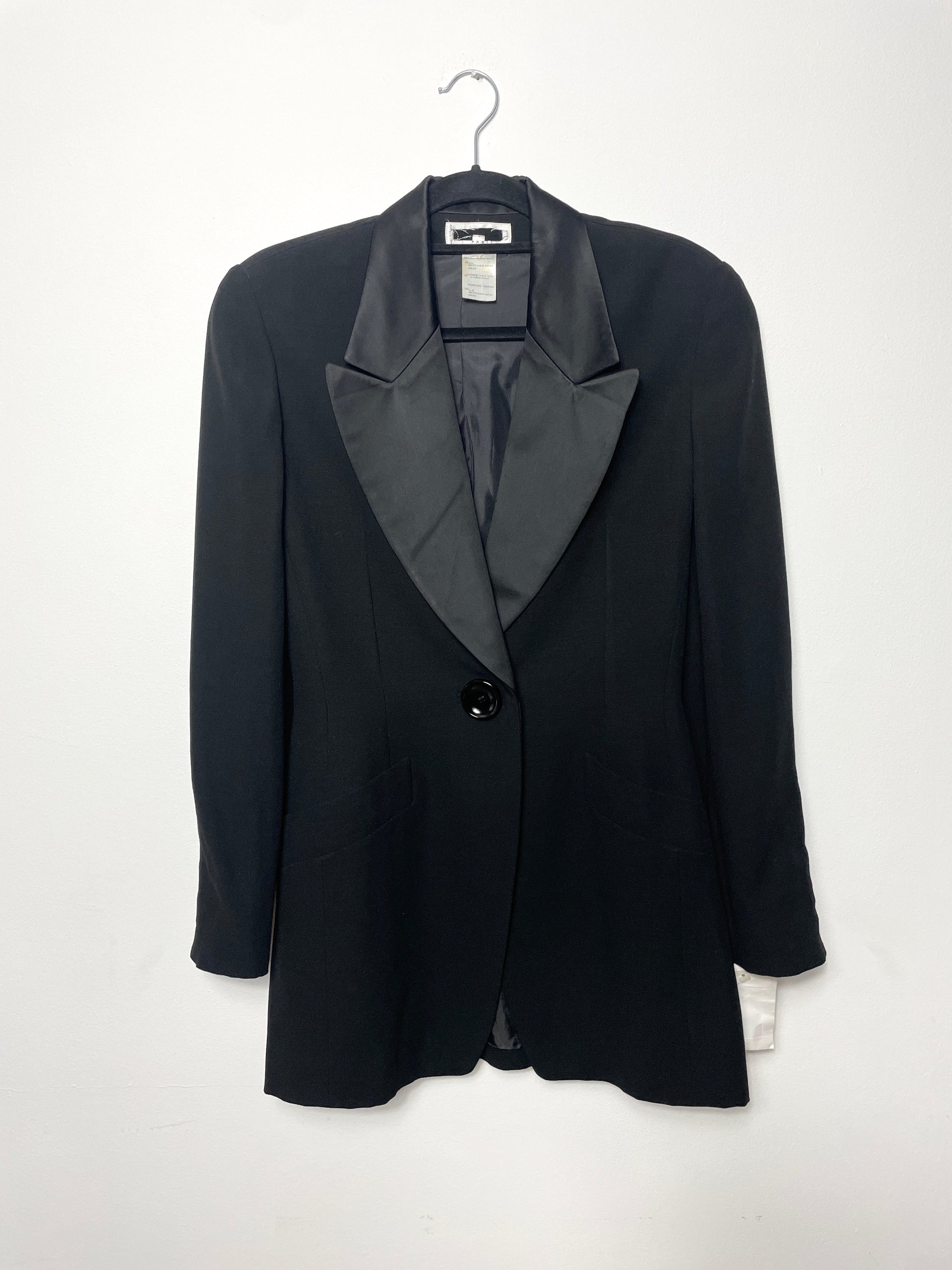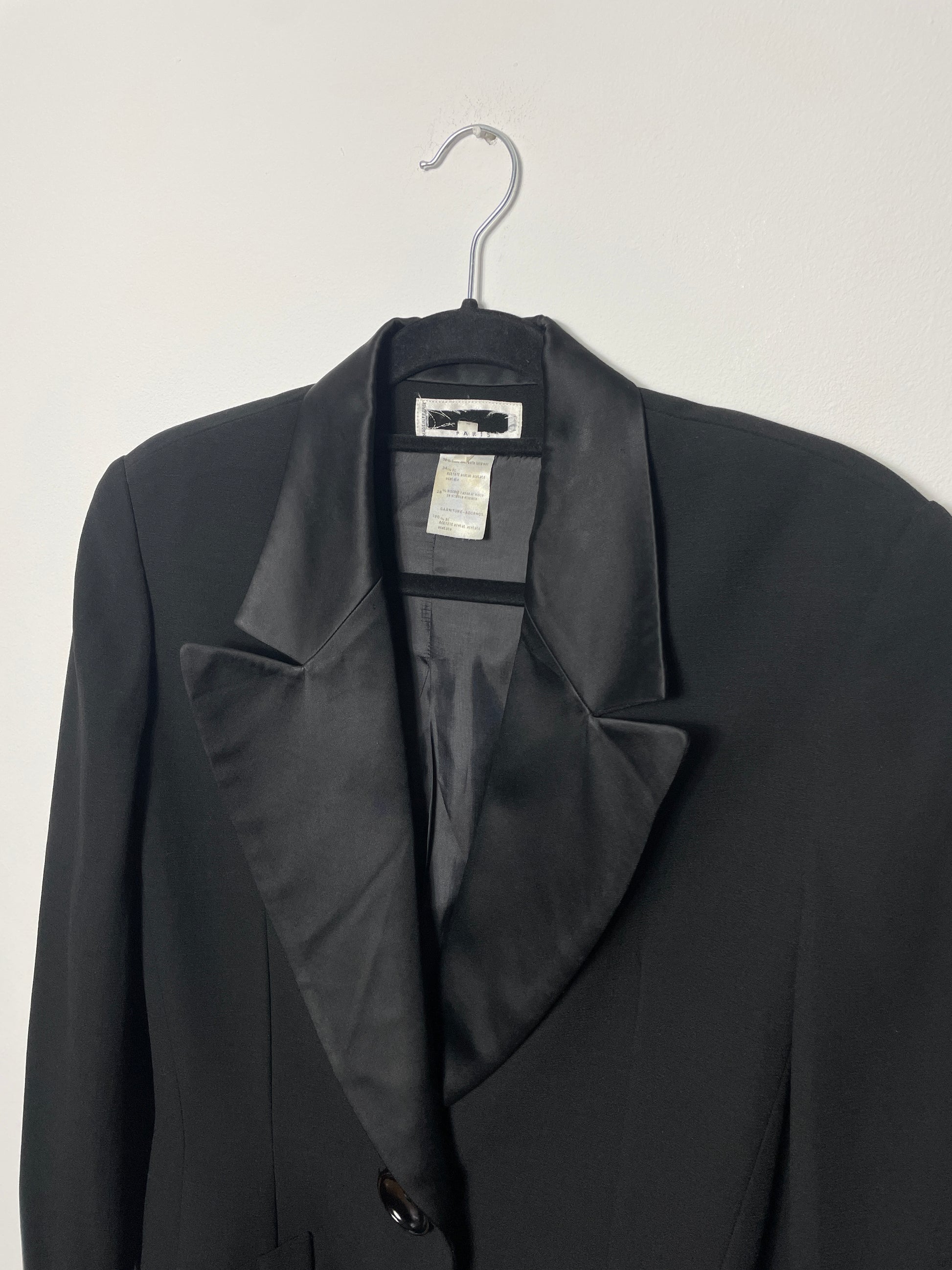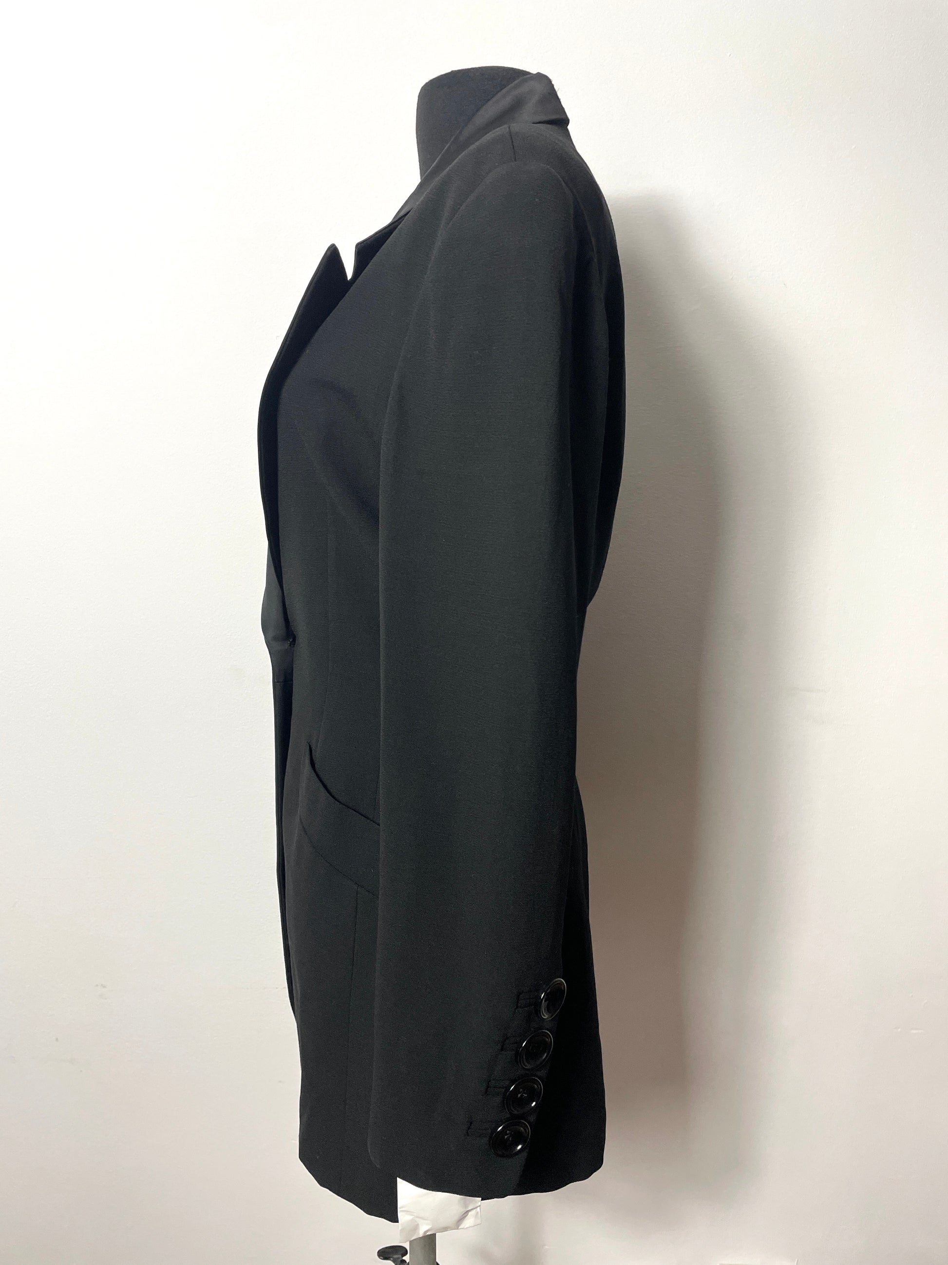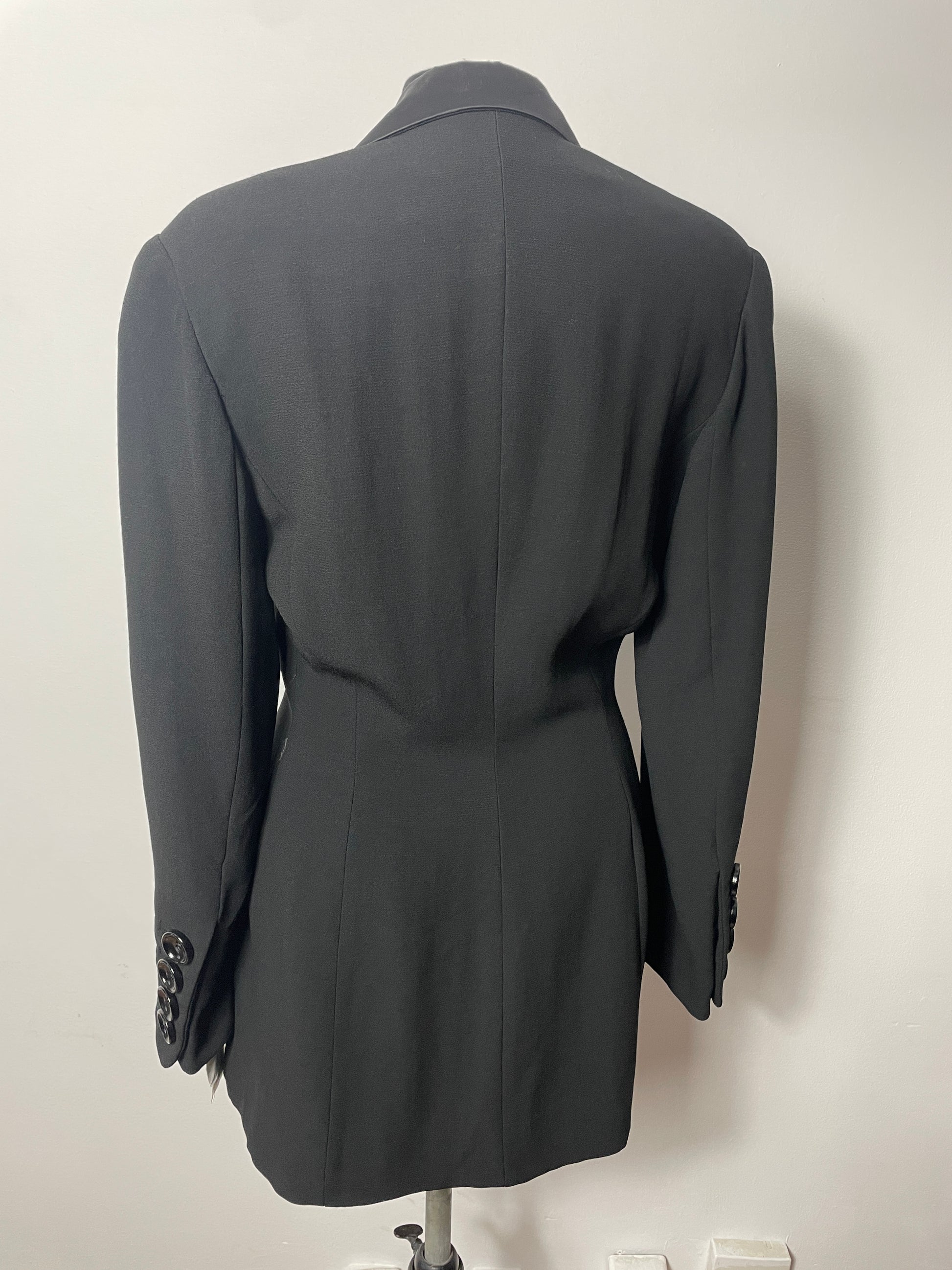 Blazer noir cintré 34/36 dégriffé, je pense qu'il est vintage et qu'il s'agit d'une grande maison style Ysl ou Mugler. Boutons de rechange. Le col a quelque traces de vécu à l'arrière sinon excellent état. Matière laine et viscose. Mesures à plat : épaules 42cm/poitrine 49cm/longueur 81cm.