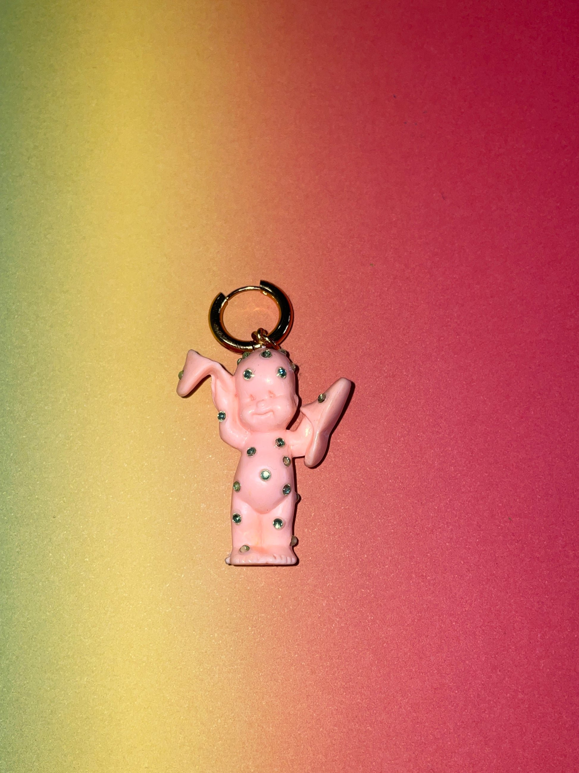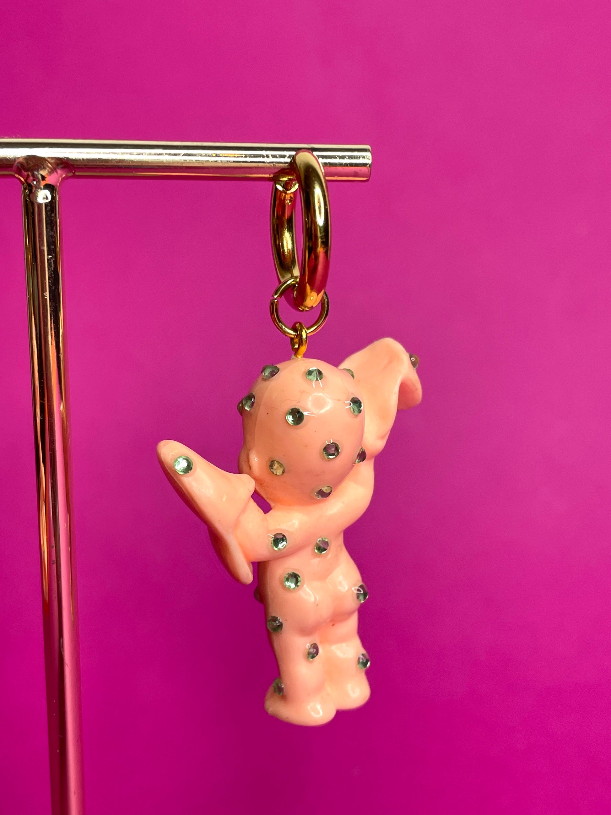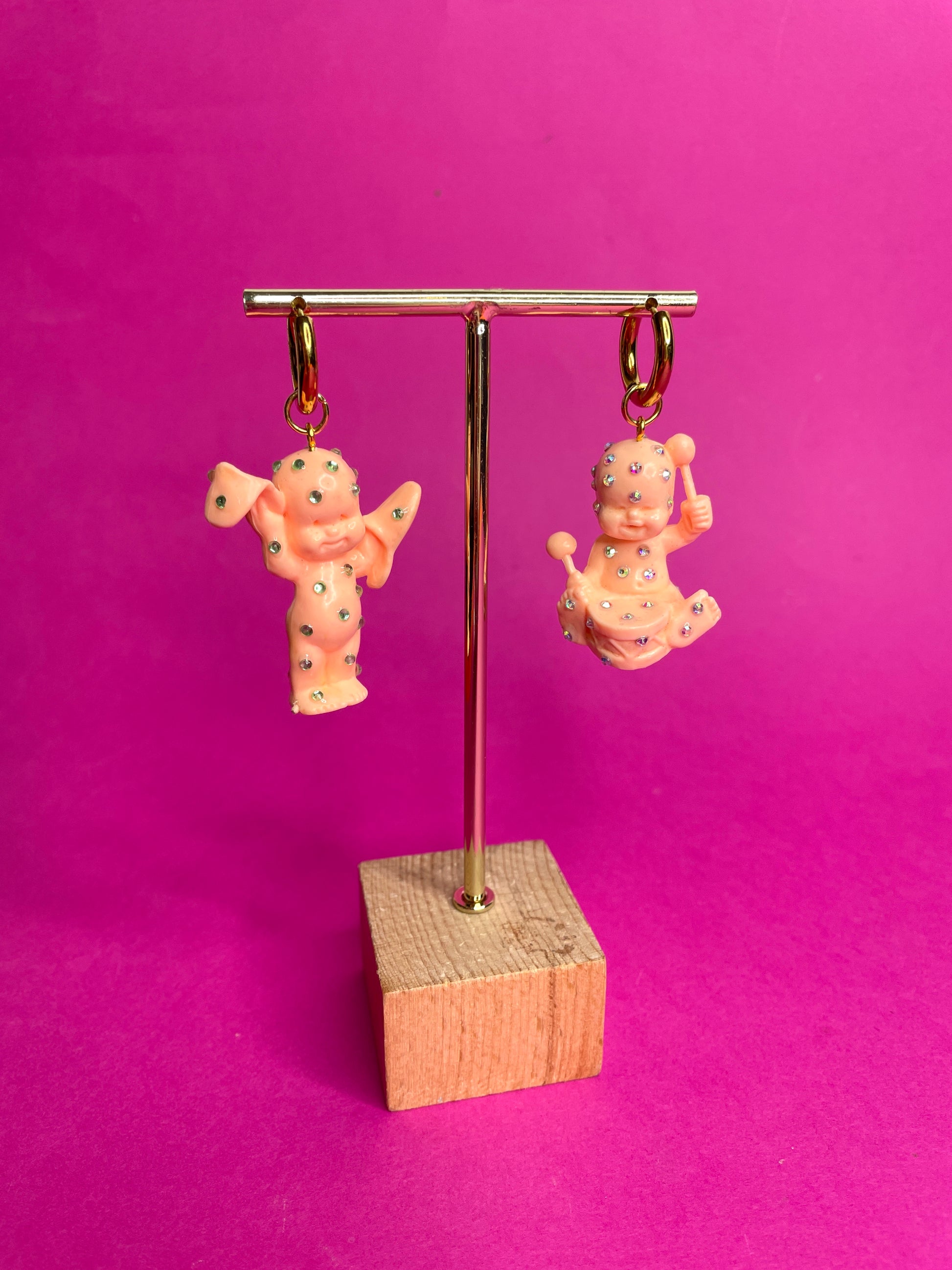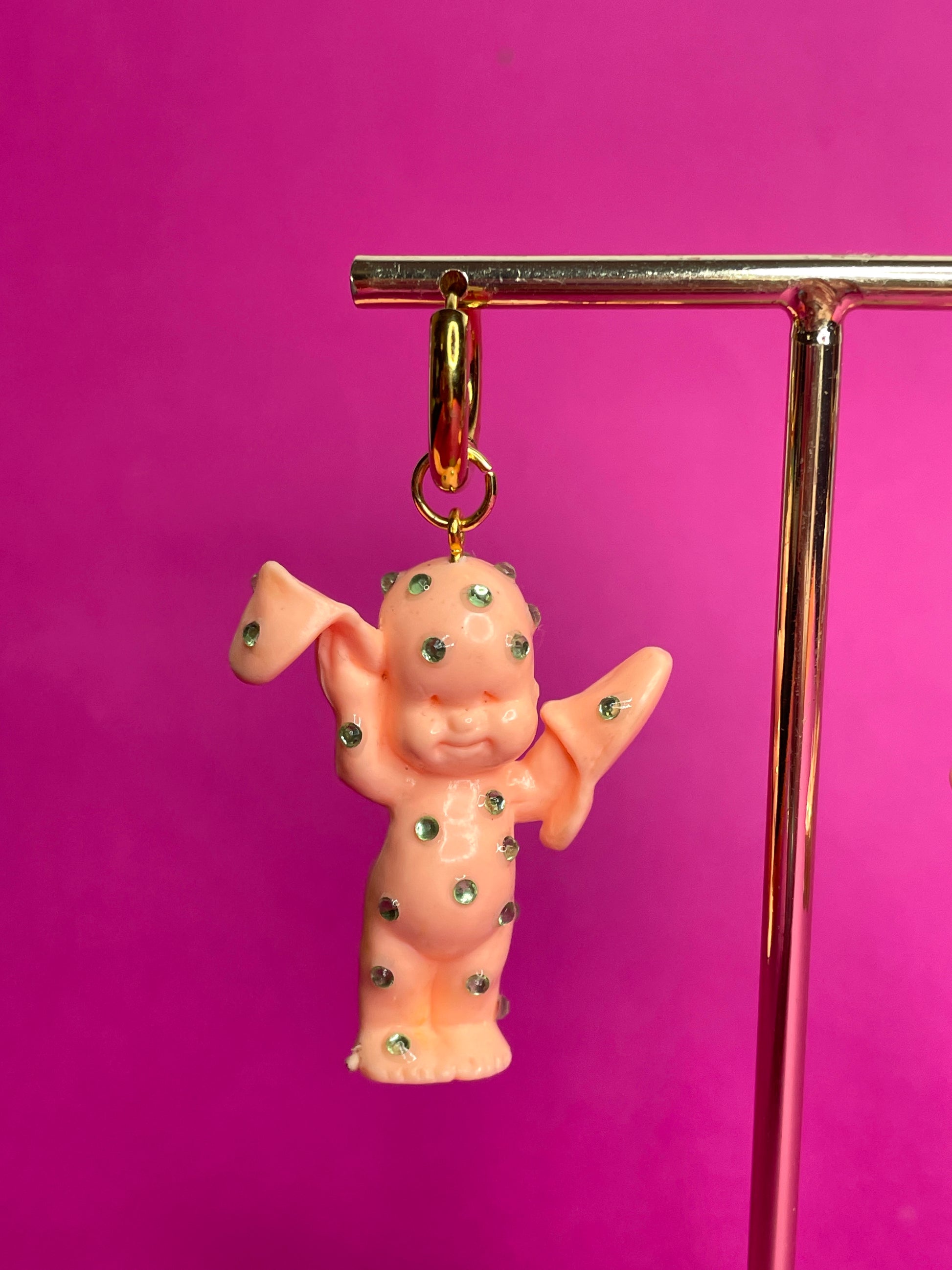 Boucle d'oreille upcyclée composé d'anneaux en acier inoxydable et d'un babies vintage customisé avec des strass verts à la résine uv. Diamètre anneau 1,5cm. Légère à porter car ce n'est pas le babies classique mais la version mini.