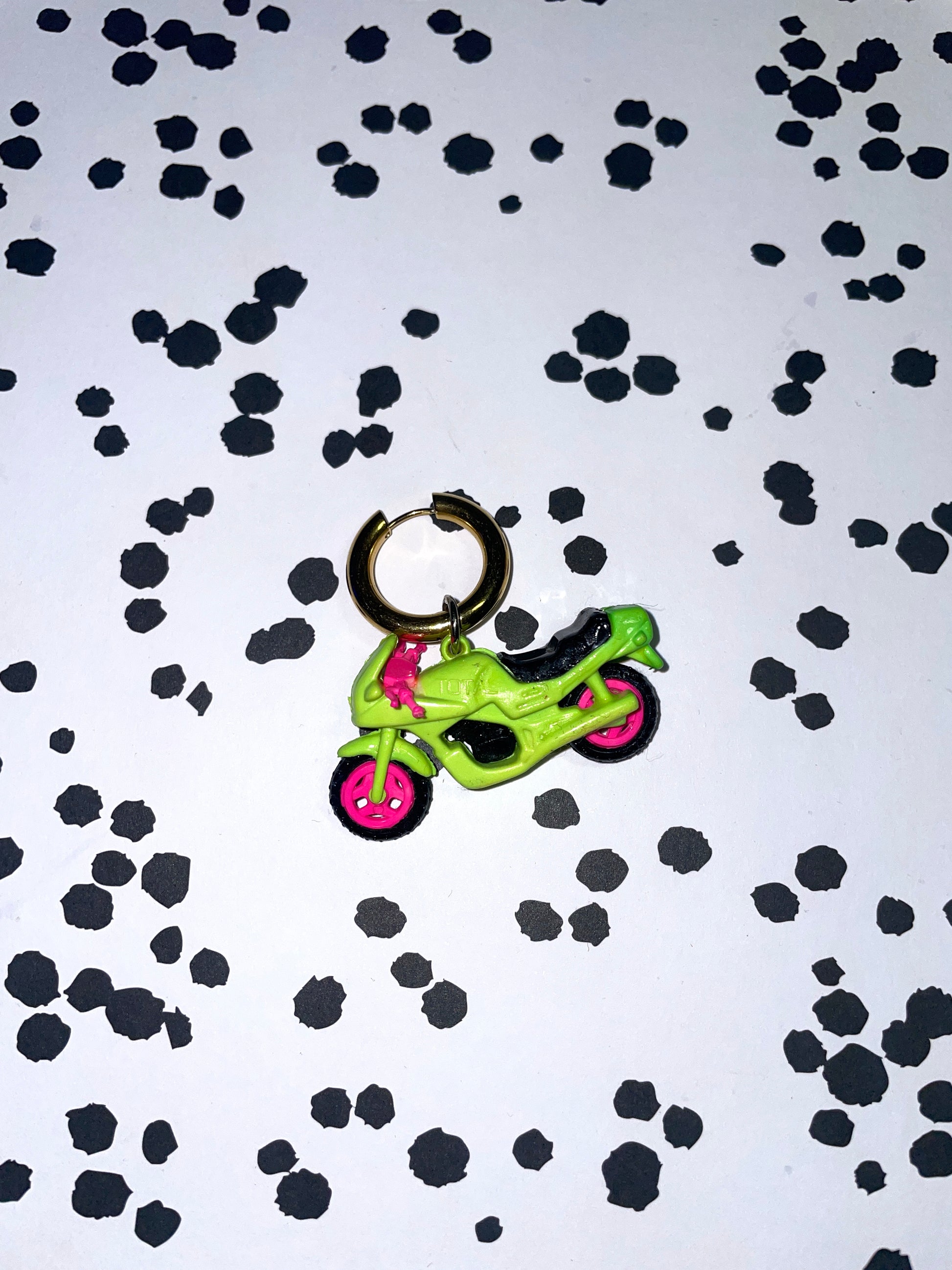 Boucle d’oreille unique faite main composée d’un anneau en acier inoxydable doré 2cm de diamètre et d'une mini moto vintage Total en plastique chinée à Montpellier.