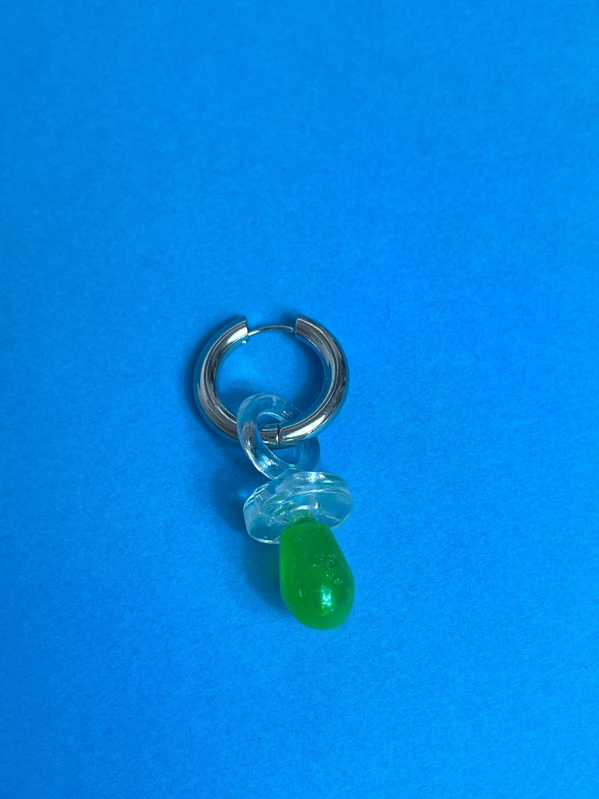 Boucle d'oreille fabriquée main composée d'un anneau en acier inoxydable, et d'un tétine en plastique verte et transparente.