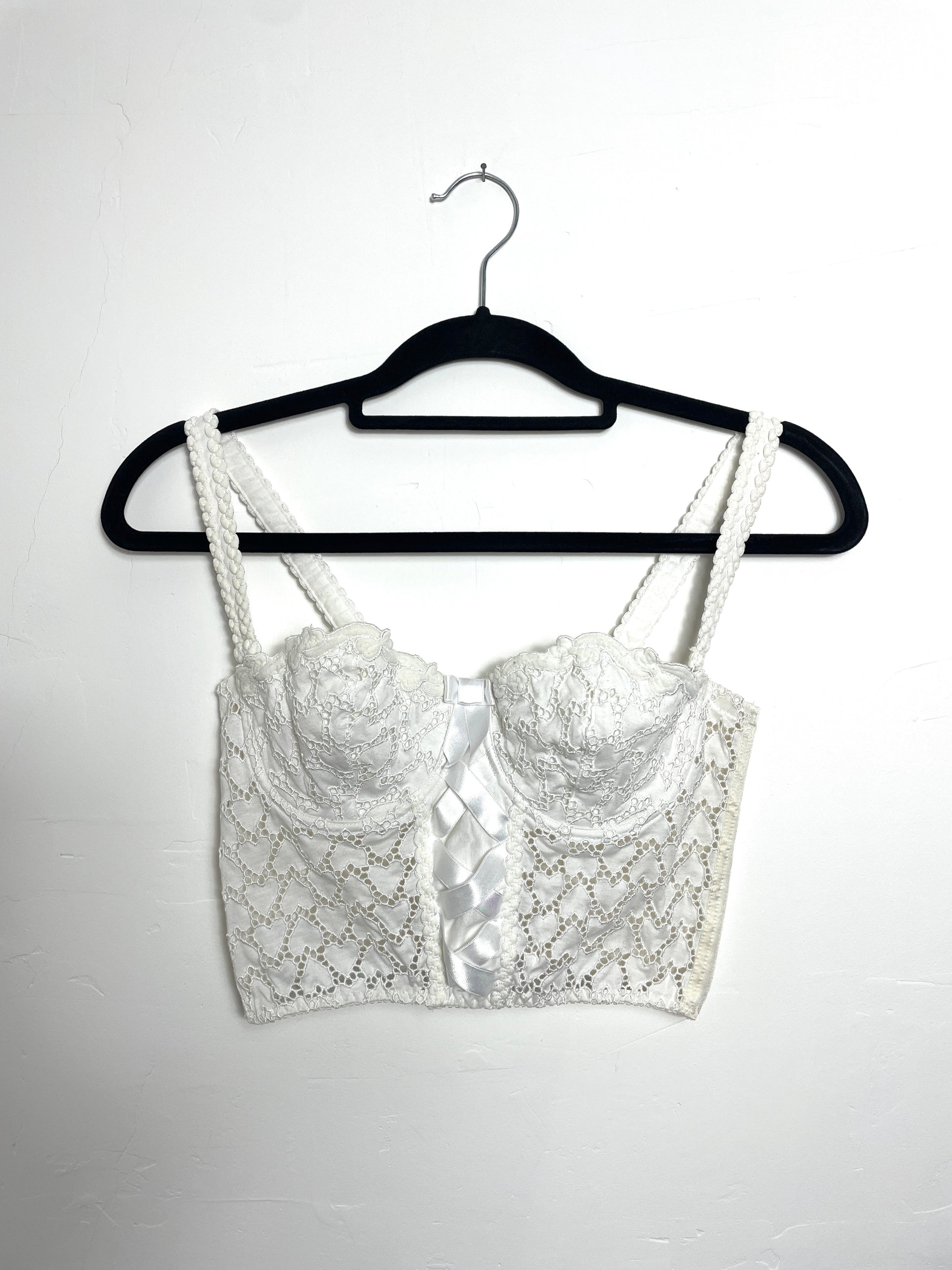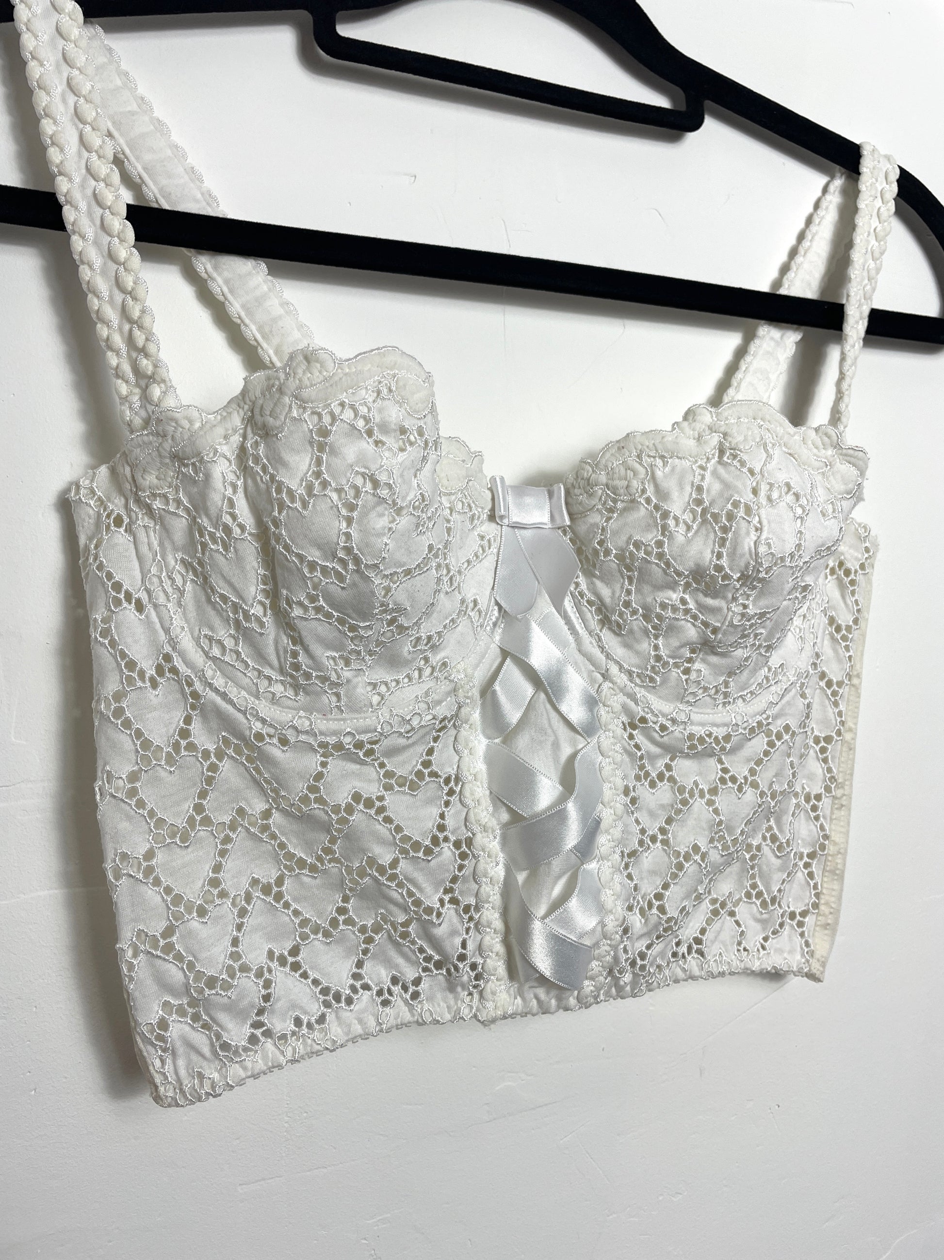 Adorable bustier/corset vintage Aubade en coton motif coeurs, attaches crochets à l'arrière. Taille indiquée 90FR, je pense qu'il s'agit d'un bonnet C. Il est présenté ici sur un mannequin taille 34 (il conviendra au 34 voire 36). Les bretelles ne sont pas réglables mais elles sont amovibles. Une pièce à porter en lingerie ou en top, sous une chemise ou en layering avec un top en mesh en-dessous.