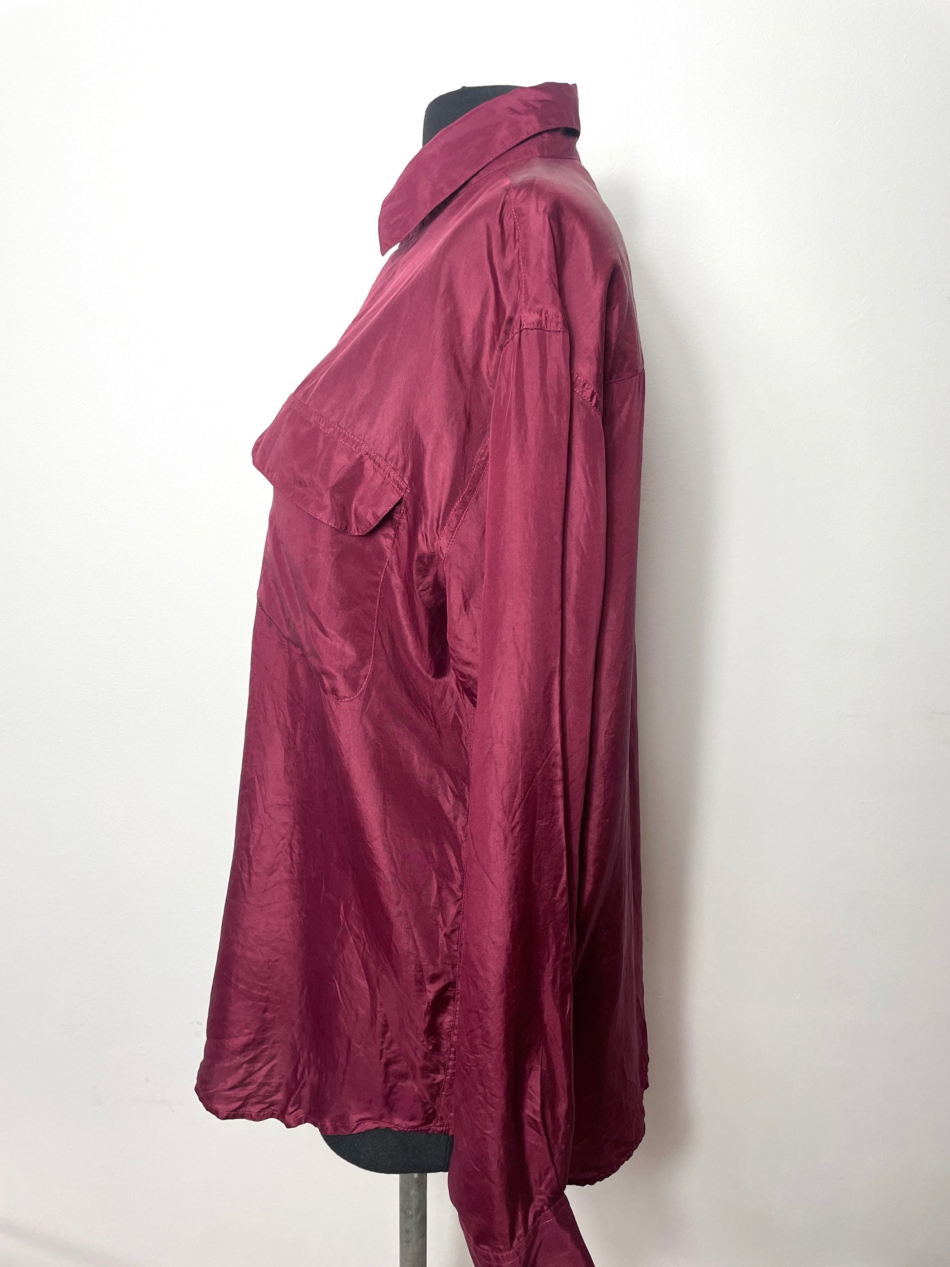 Chemise vintage 90s en soie bordeaux, taille 34 à 38. Très bon état. Taille M homme. Mesures à plat : épaules 50/poitrine 55cm/longueur 78cm.