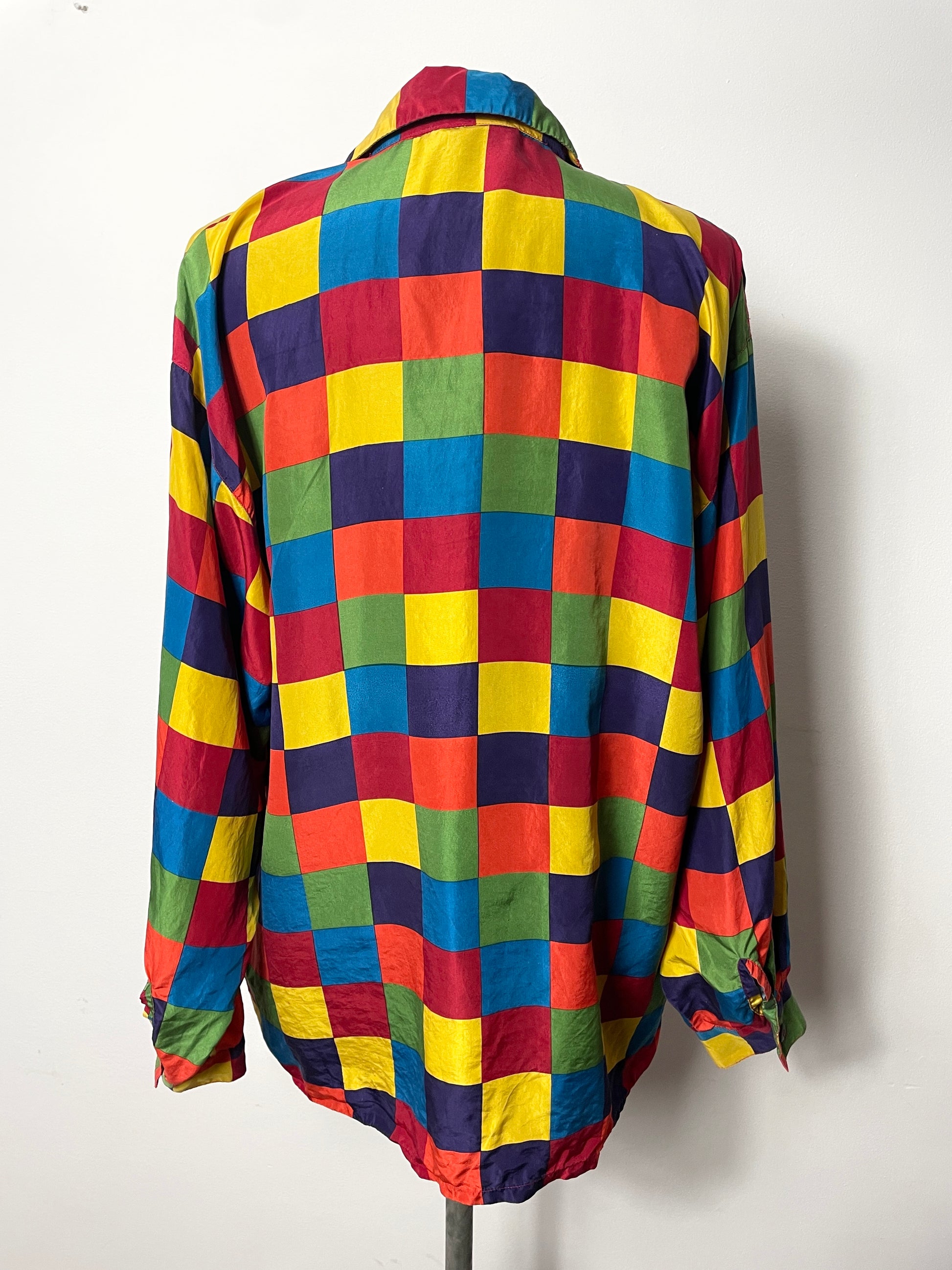 Chemise Naf Naf vintage 90s en soie, imprimé Arlequin. Taille L qui correspondra jusqu'au 40/42. Elle a quelques petits défauts ça et là (un petit fil tiré, des mini taches) mais pas de trous et rien de voyant (voir photos). Une très belle pièce collector.