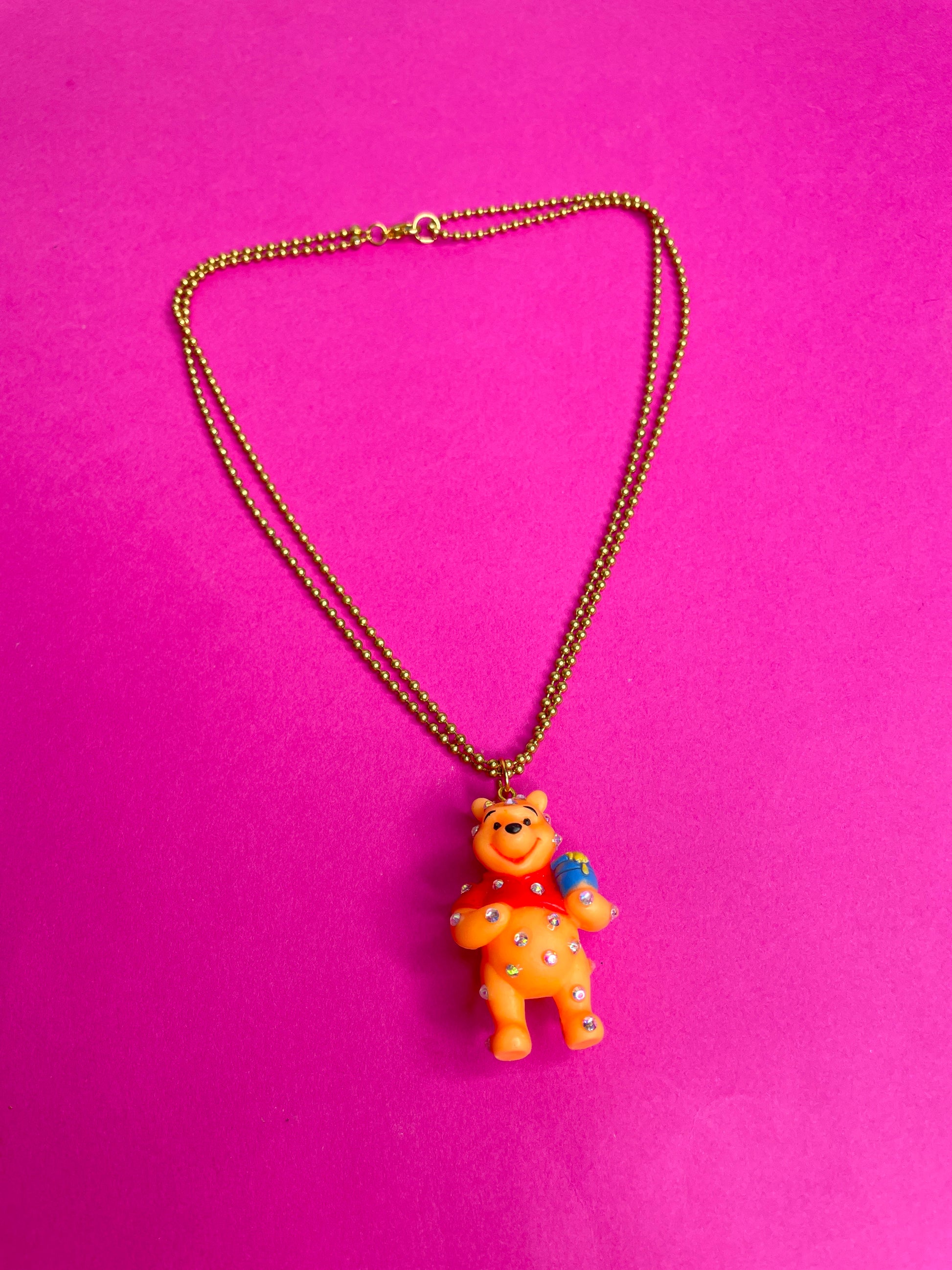Collier upcyclé composé d’une chaîne vintage en métal doré patiné et d'un pendentif Winnie l’Ourson vintage customisé avec des strass à la résine uv. Longueur collier 42cm.