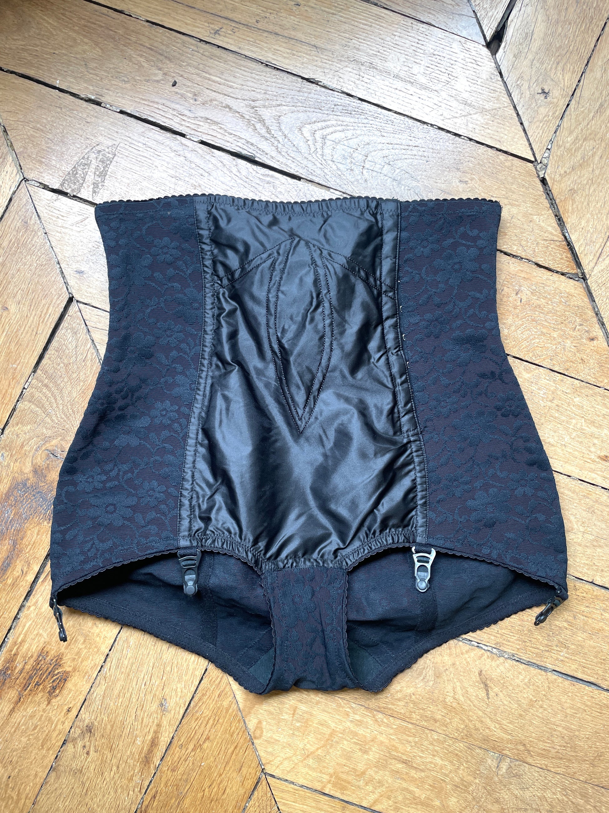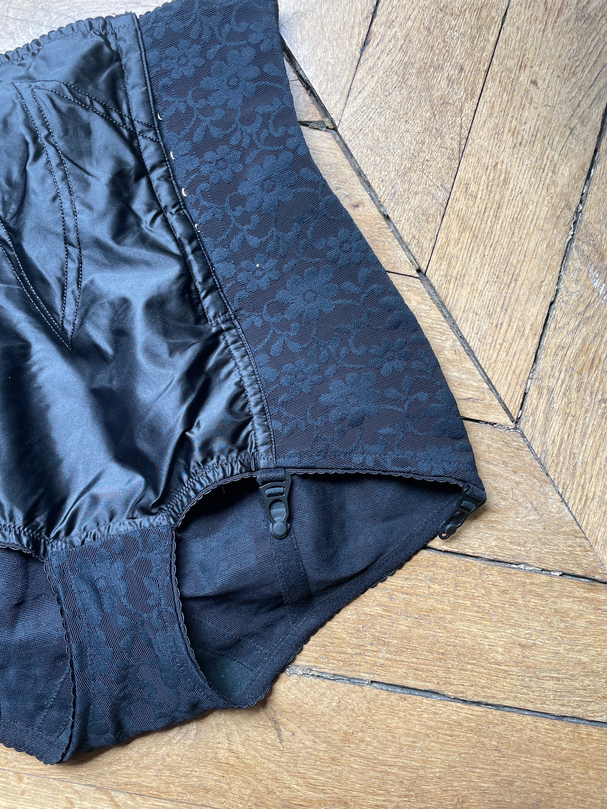 Culotte gaine vintage noire taille haute avec motifs fleurs dentelle et empiècemen en satin. Taille L. Tissu extensible.