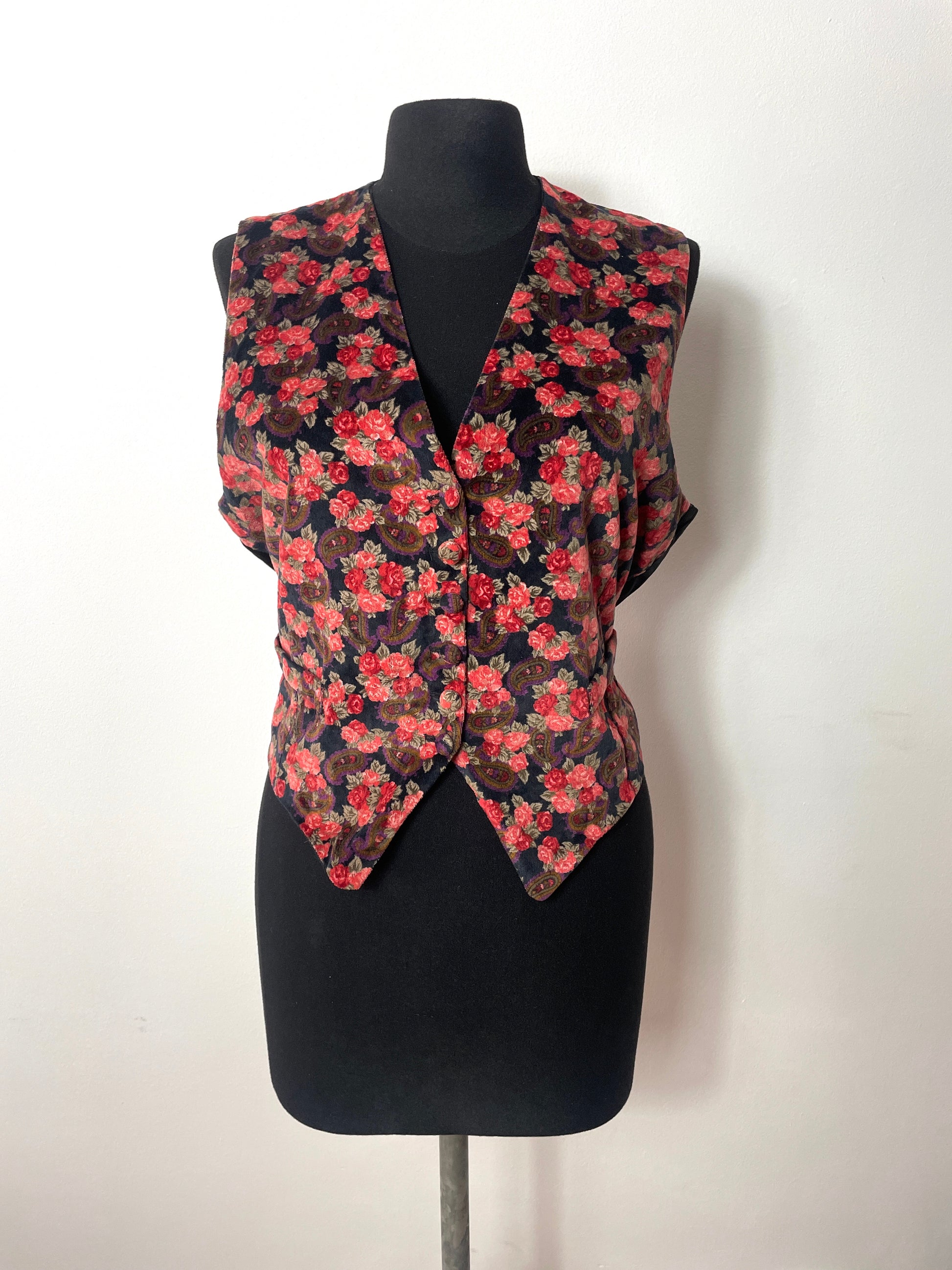 Très joli gilet vintage 90s de la marque Cotton Square en velours à fleurs, taille 38/40, martingale à l'arrière pour ajuster. Conviendra aux tailles en-dessous porté un peu plus large. À porter seul avec un pantalon large ou sur une chemise, un col roulé, un t-shirt...