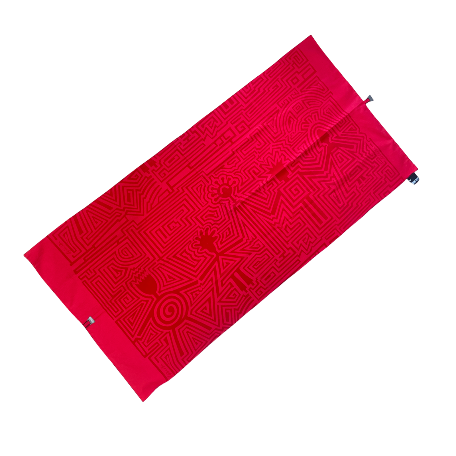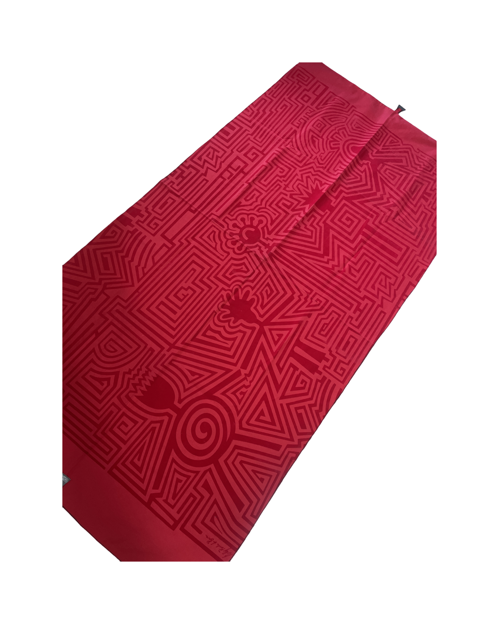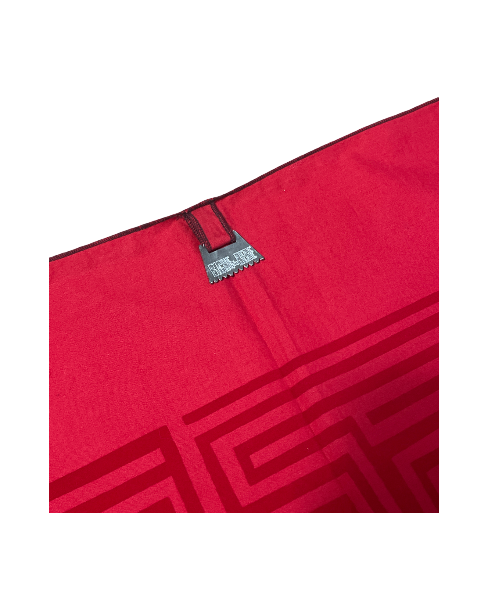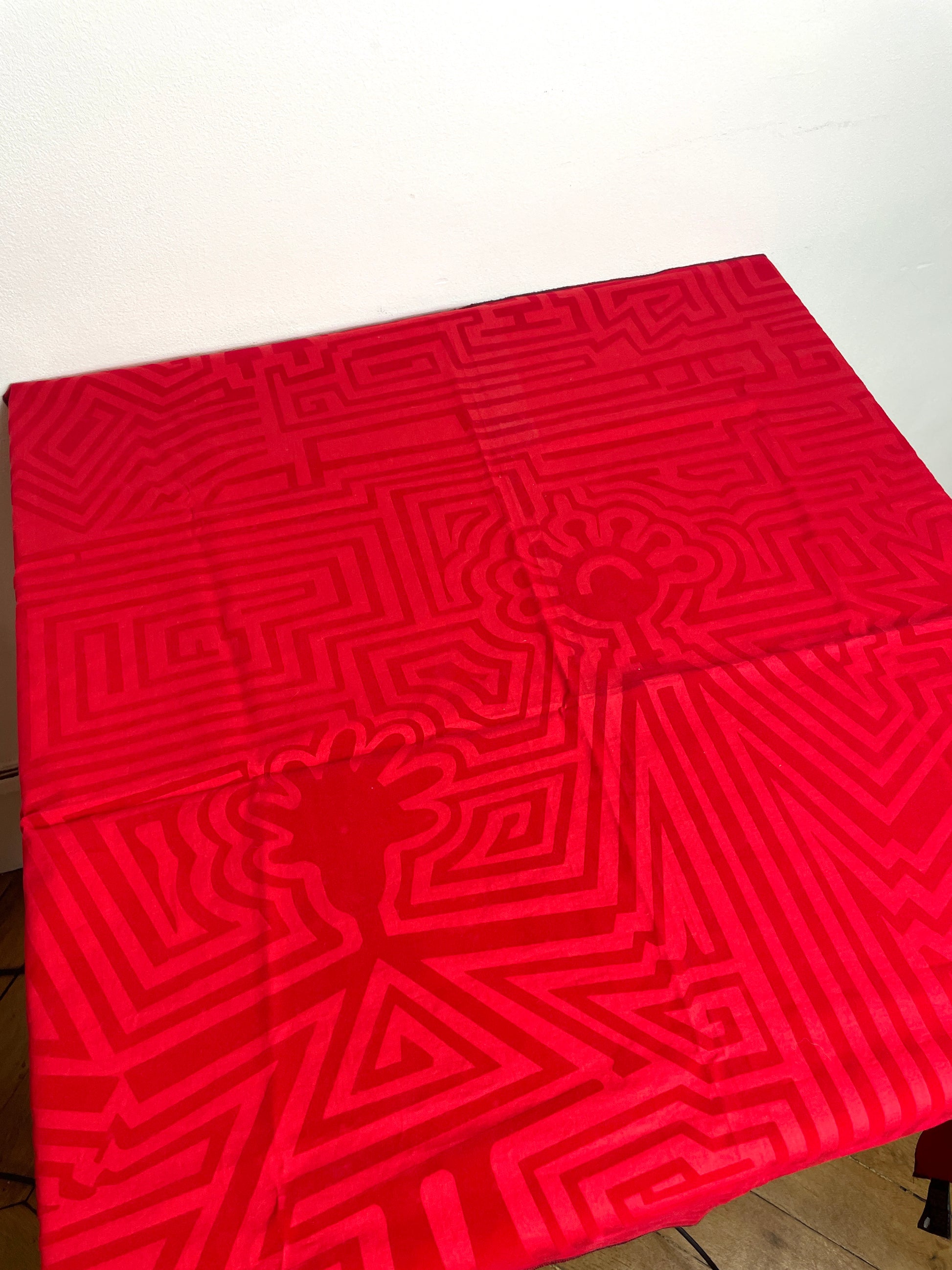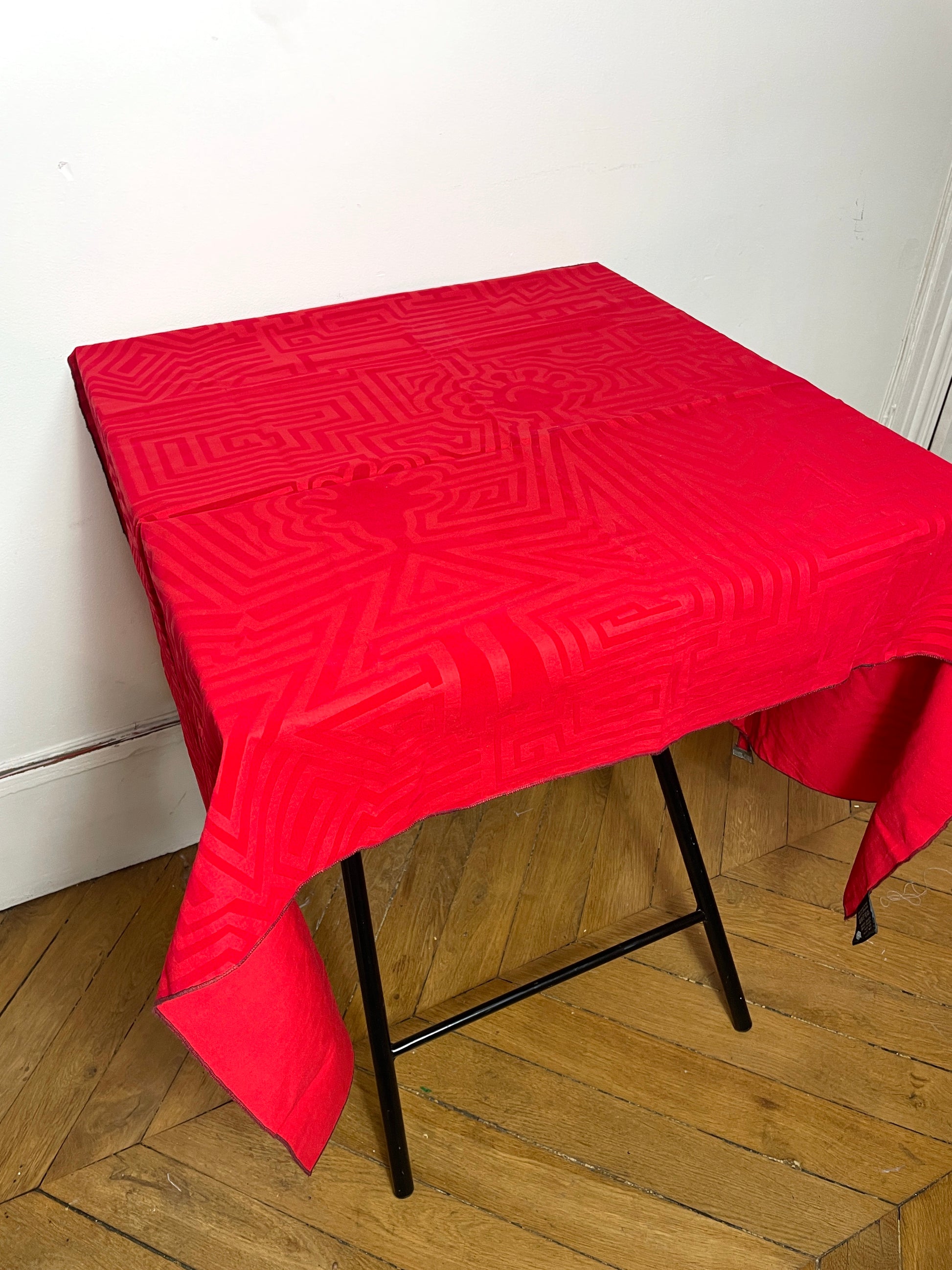 Très jolie petite nappe Biche de Bere vintage 90s, rouge, coton et velours avec motifs personnages et petite médaille de la marque en métal.