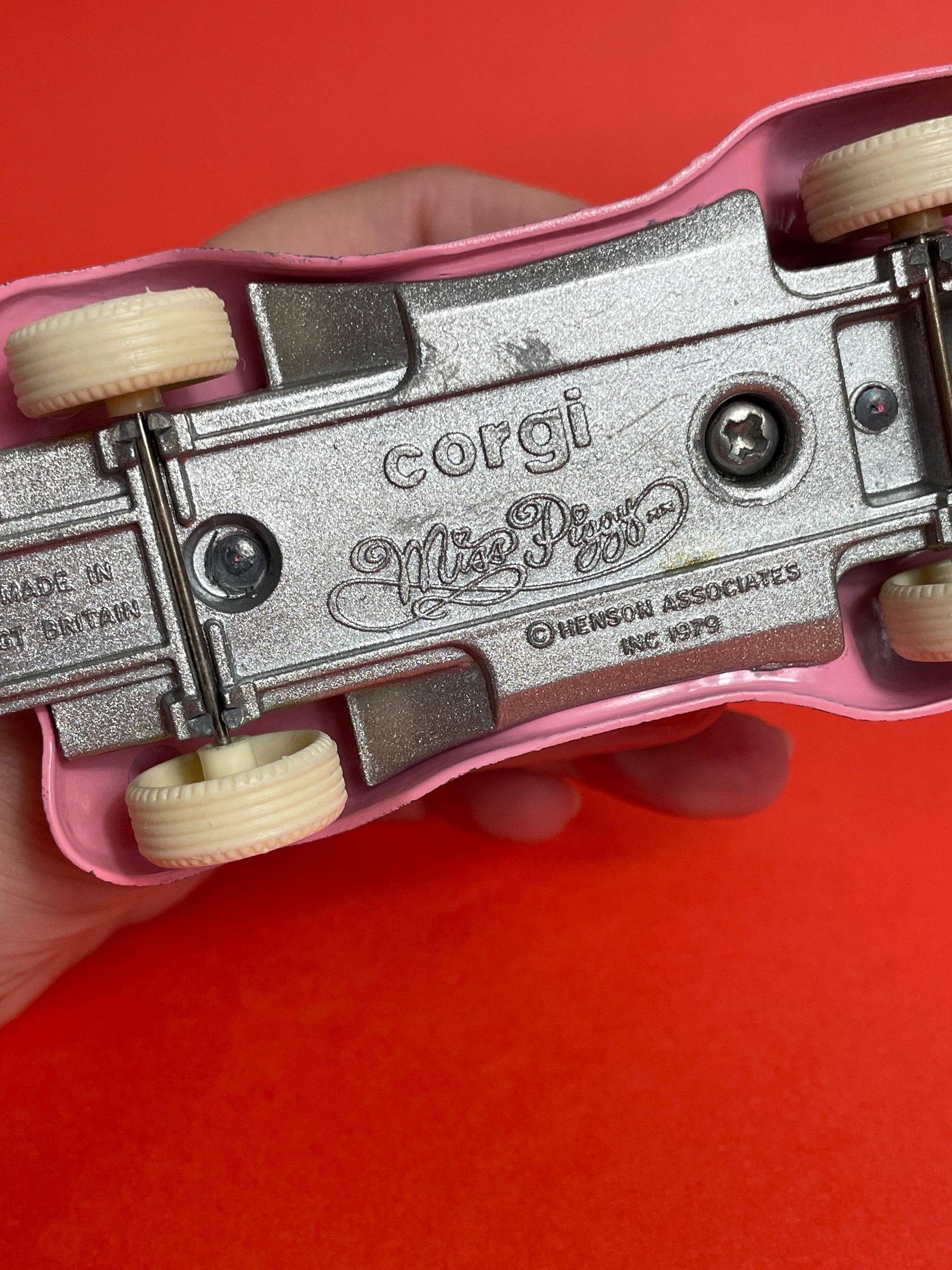 Figurine petite voiture Miss Piggy en métal qui roule bien, 1979. Très bon état pour son ancienneté. Marque Corgi, made in Britain. 9x5cm.