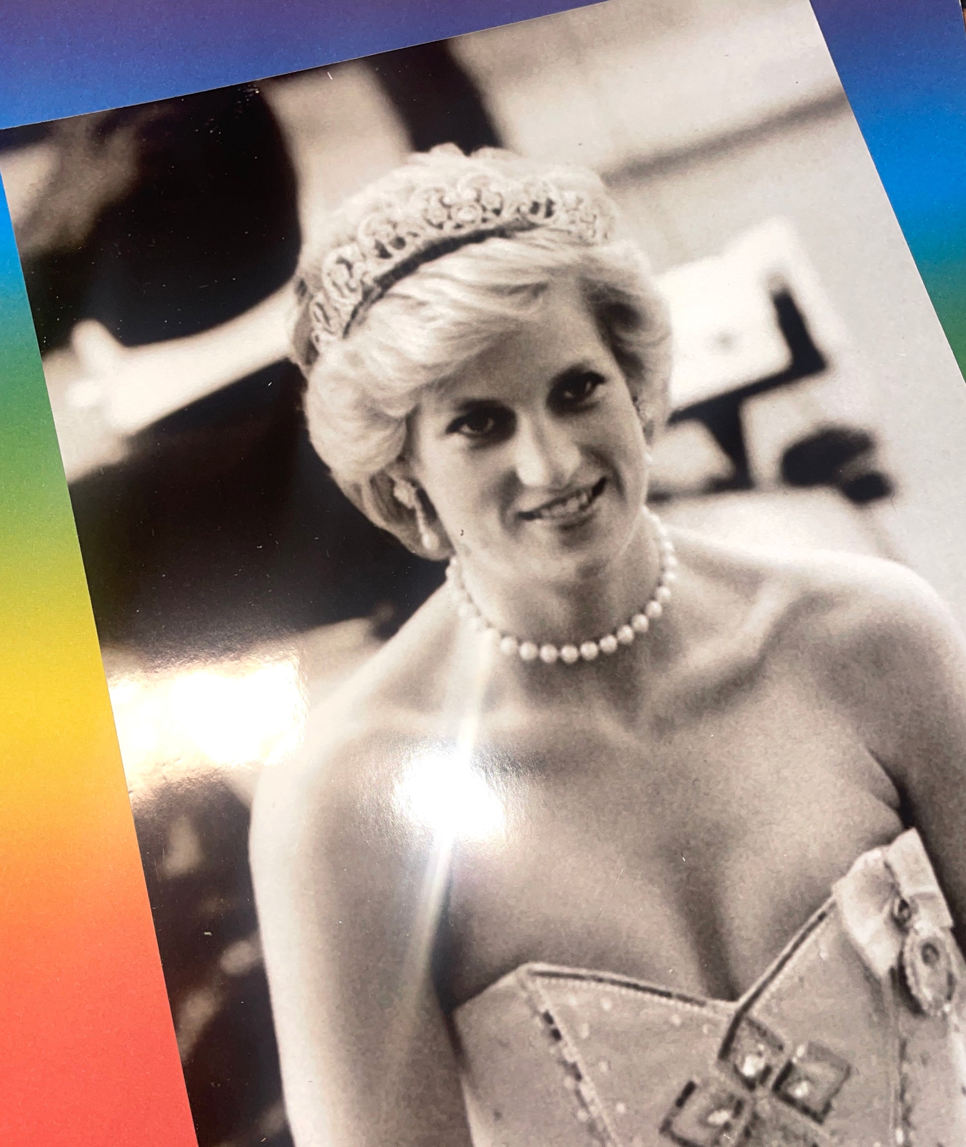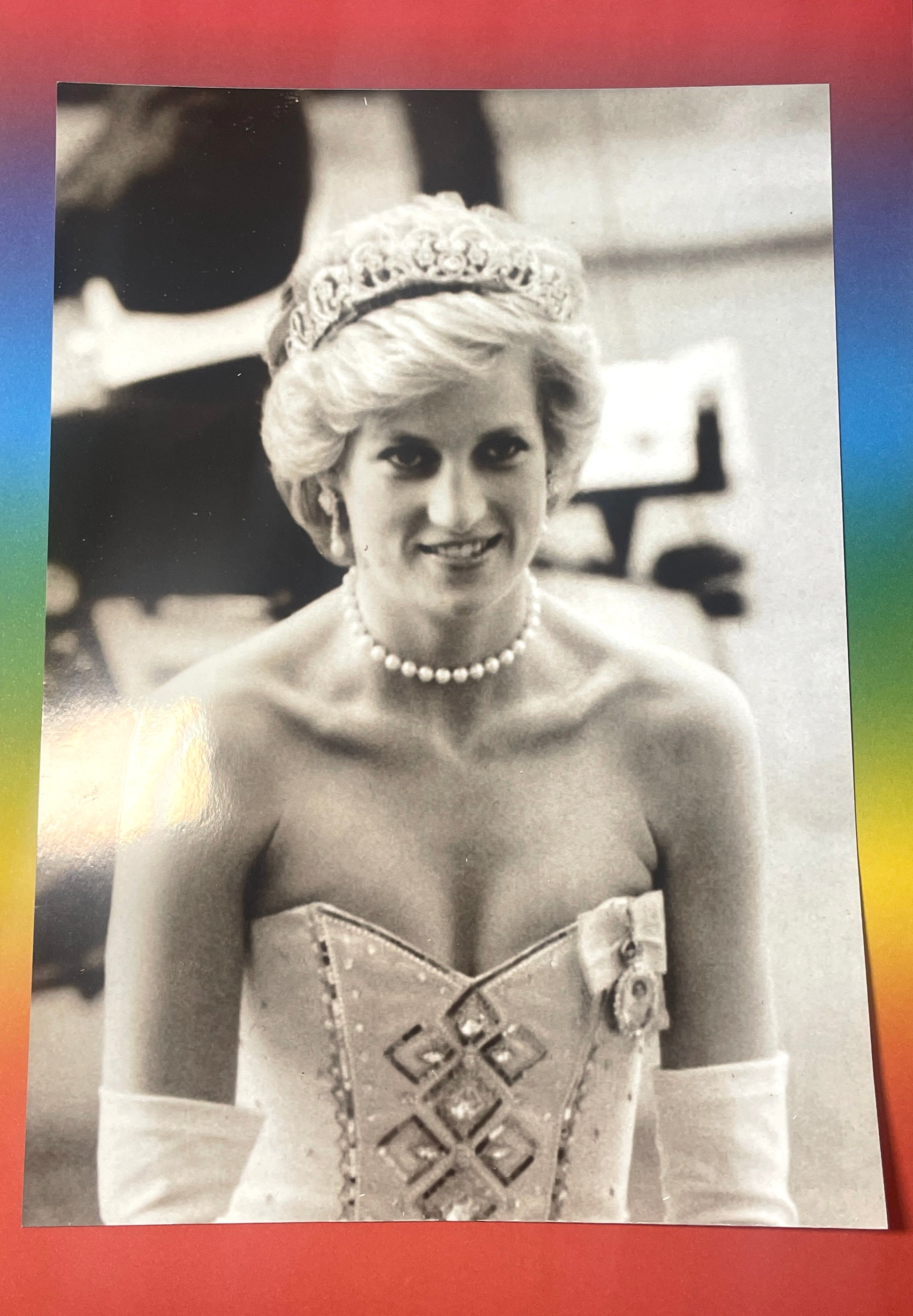 Photographie en noir et blanc format A4 de Lady Diana. Sur cette photo elle porte une robe crée par Elizabeth et David Emanuel (la même marque qui a fait sa robe de mariée), datant de 1986 et révélée lors du British Red Cross fashion show. Lady Di l'a portée pour un banquet à l'ambassade d'Allemagne à Londres (comme ici), pour aller voir le ballet du bolchoï à l'Opera ou encore pour la première du film The Living Daylights (un James Bond avec Timothy Dalton) en 1987. La robe a été vendue pour 100 000 livres aux enchères par la maison Kerry Taylor.
