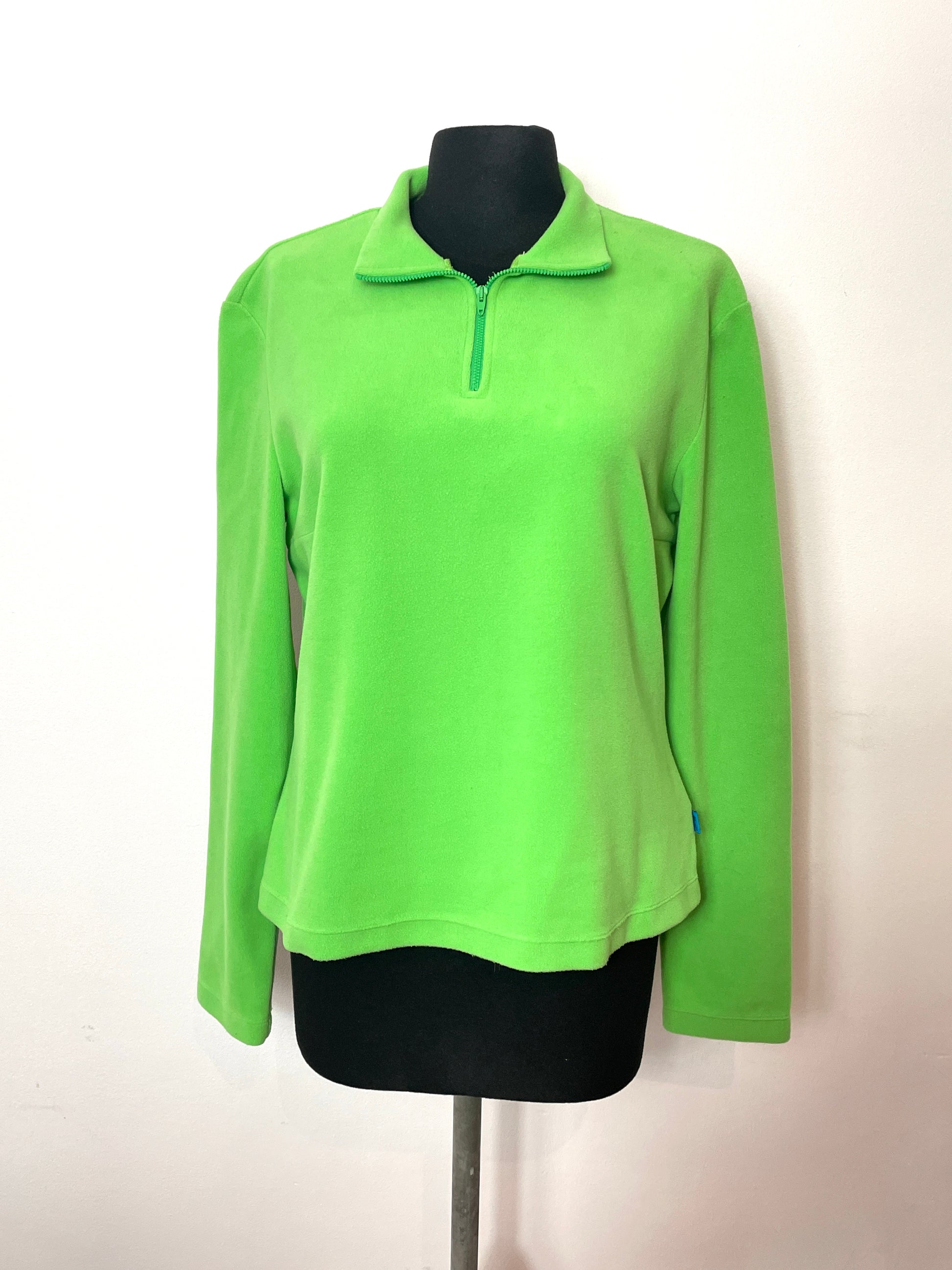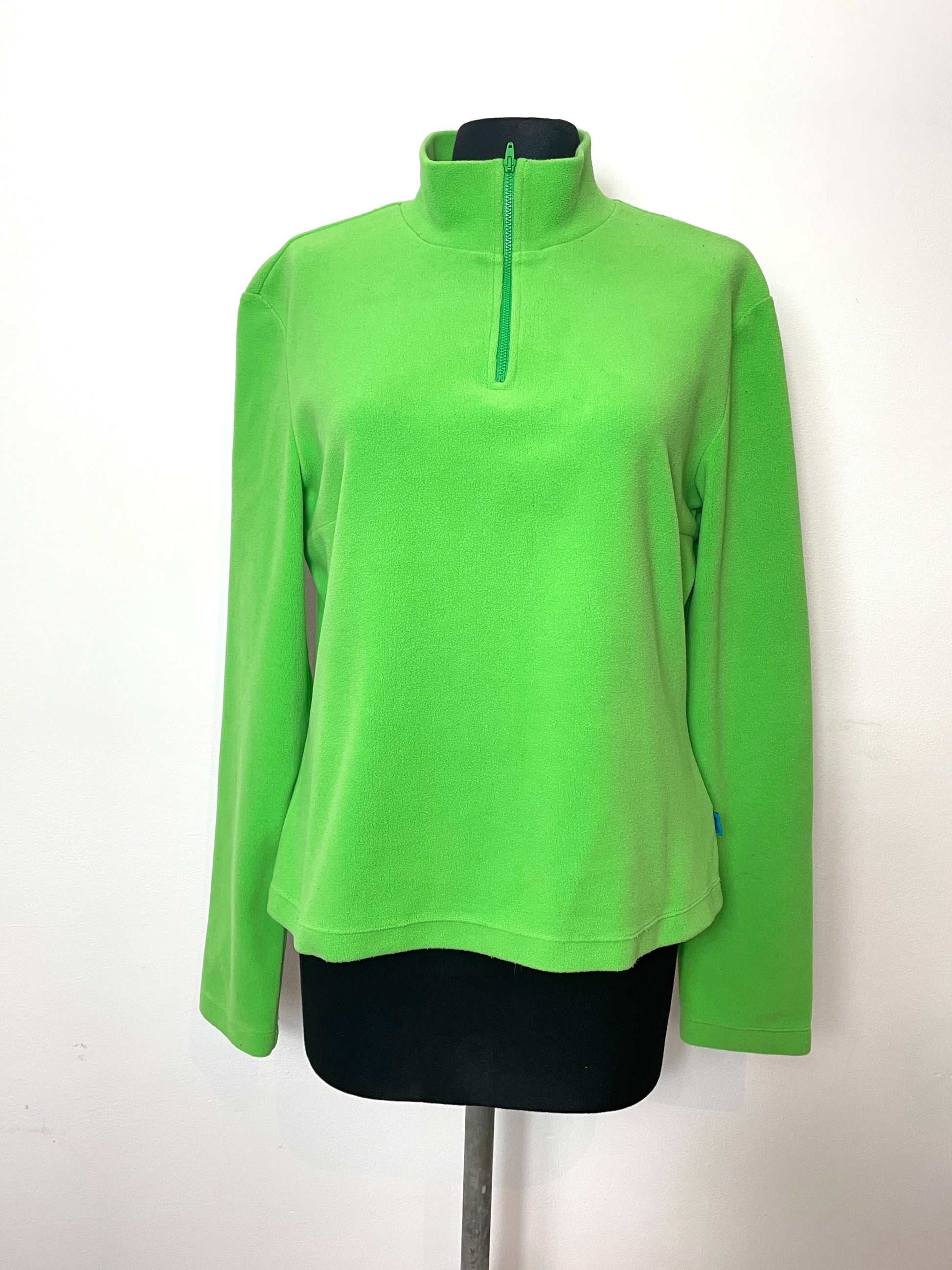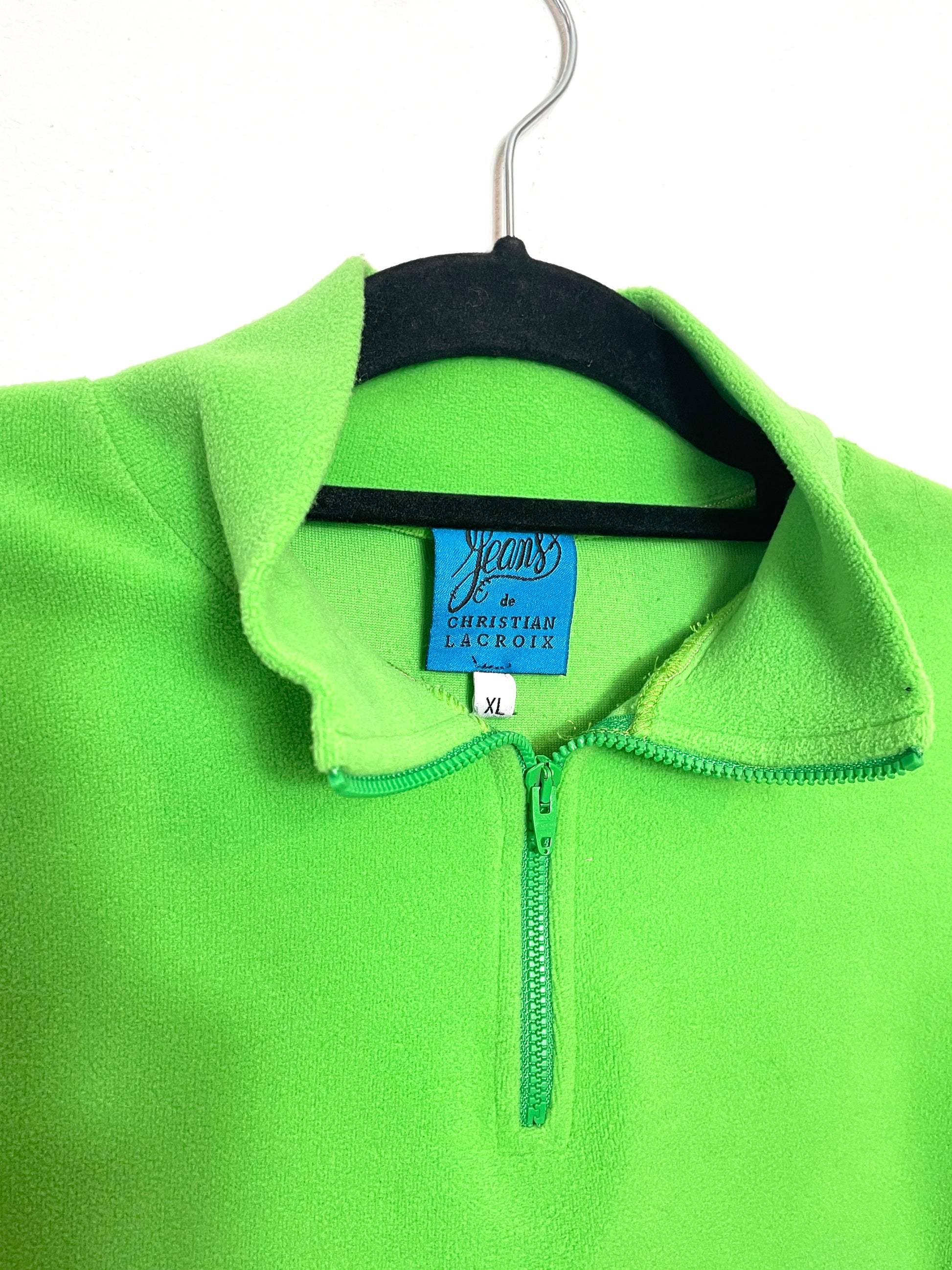 Pull polaire fin Christian Lacroix vert avec impression dans le dos, excellent état, l'étiquette indique un XL mais il correspond à un L. Mesures à plat : épaules 45cm/poitrine 52cm/longueur 59cm.