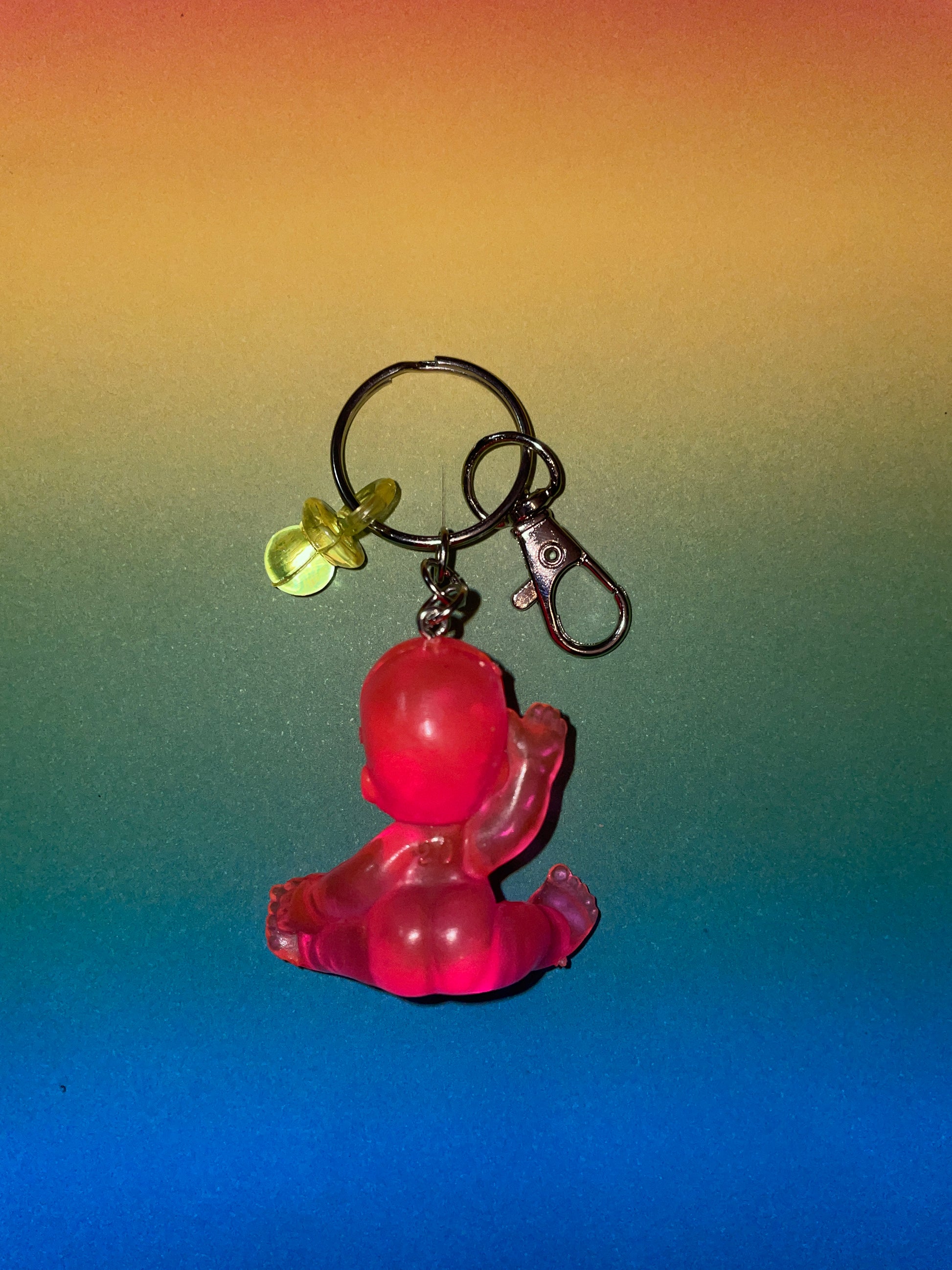 Porte-clés fabriqué main composé d'une figurine babies vintage (Galoob), personnage "Dominique la mystique " rose fluo, d'un mini mousqueton et d'une tototte jaune.