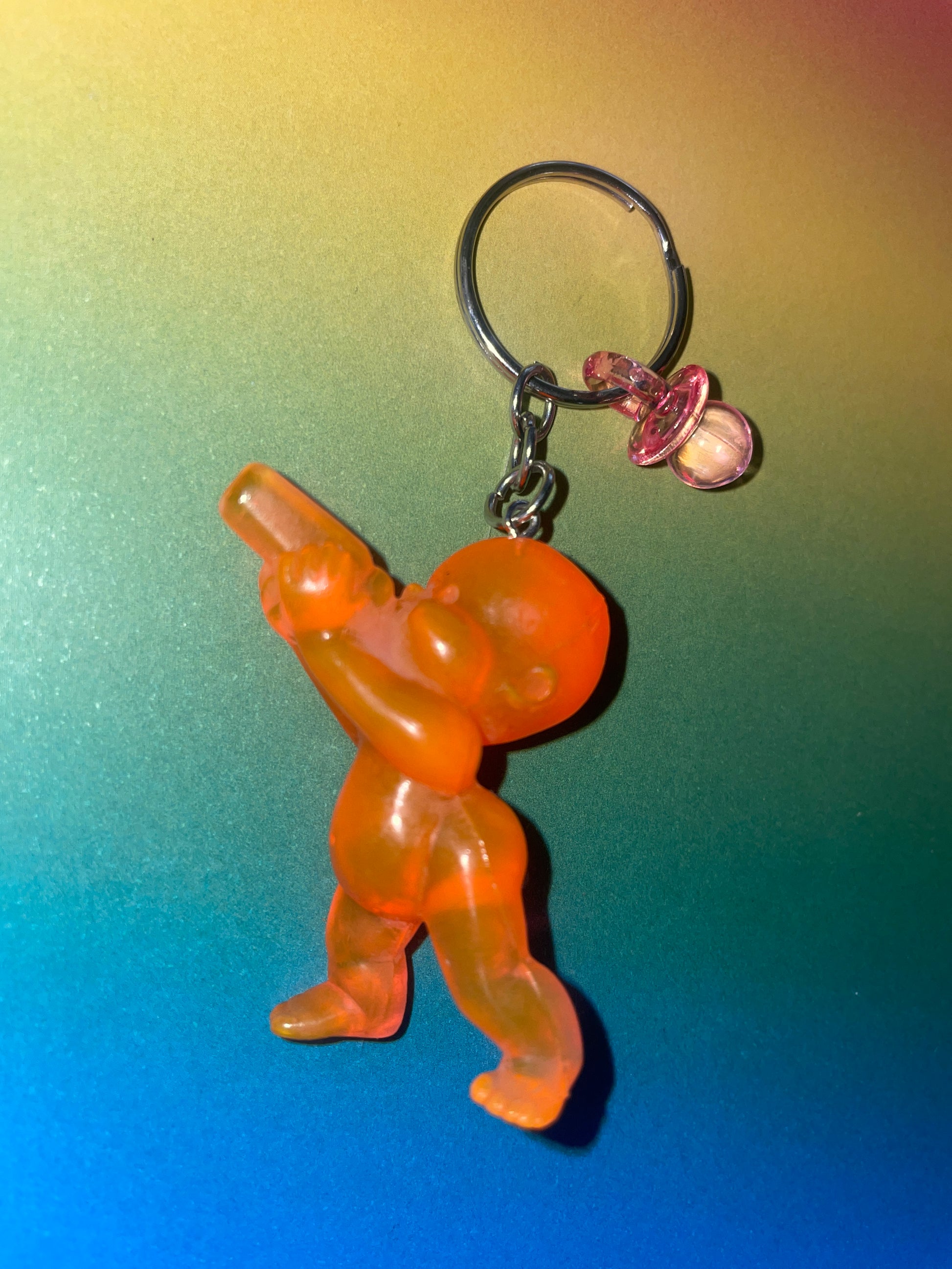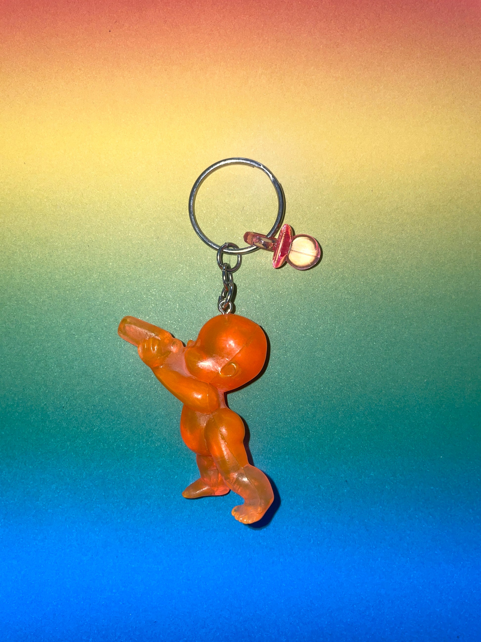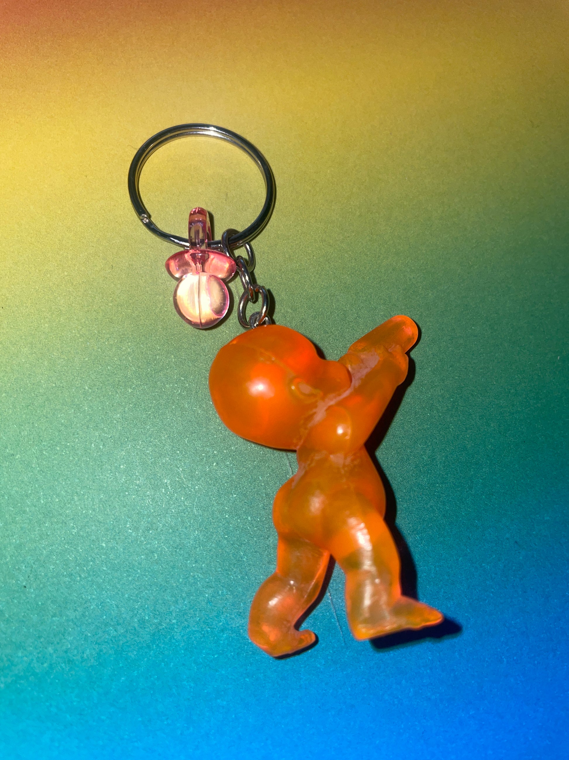 Porte-clés fabriqué main composé d'une figurine babies vintage (Galoob) "Etienne à la tienne" en plastique orange translucide et d'une tototte rose.