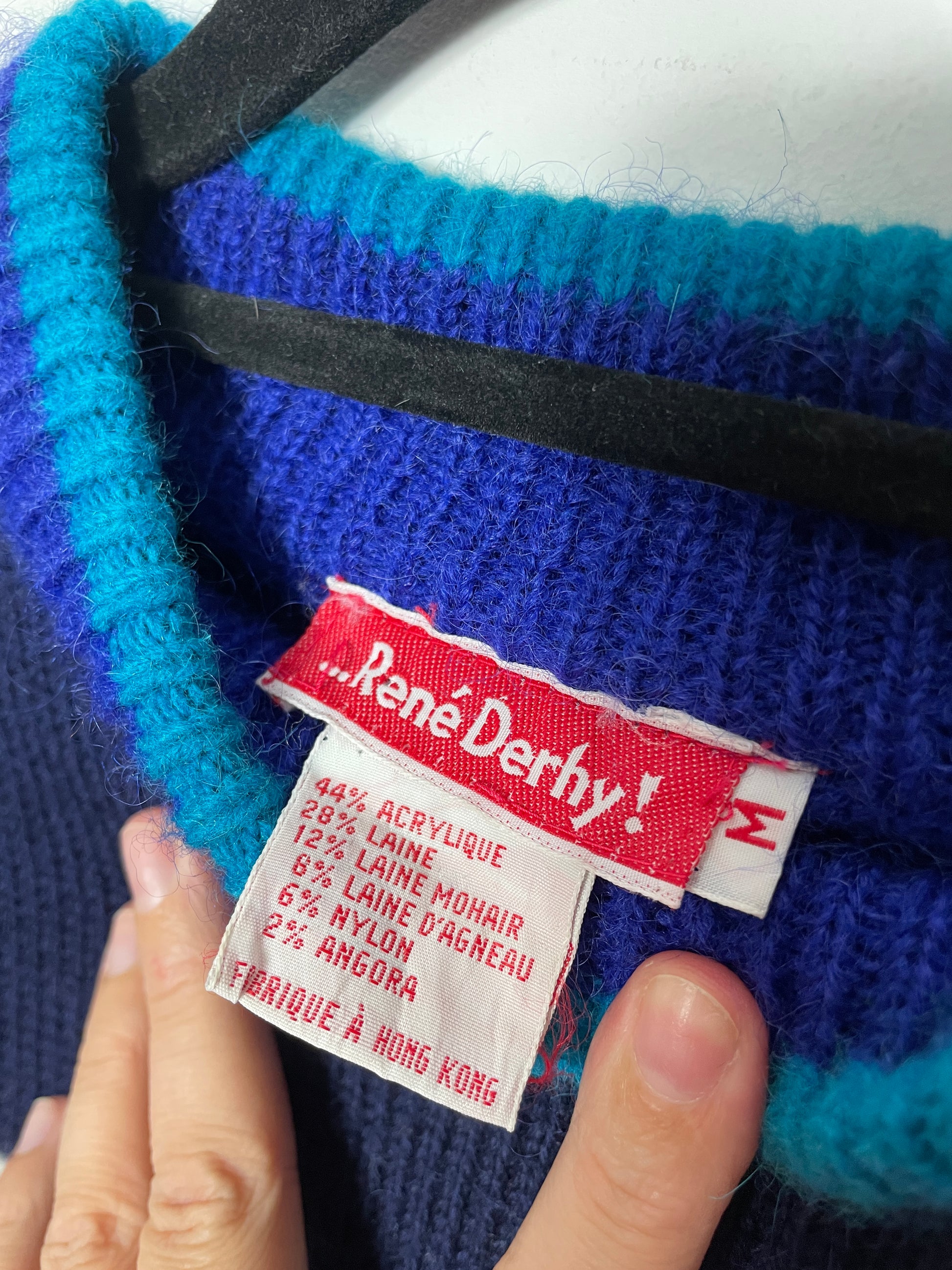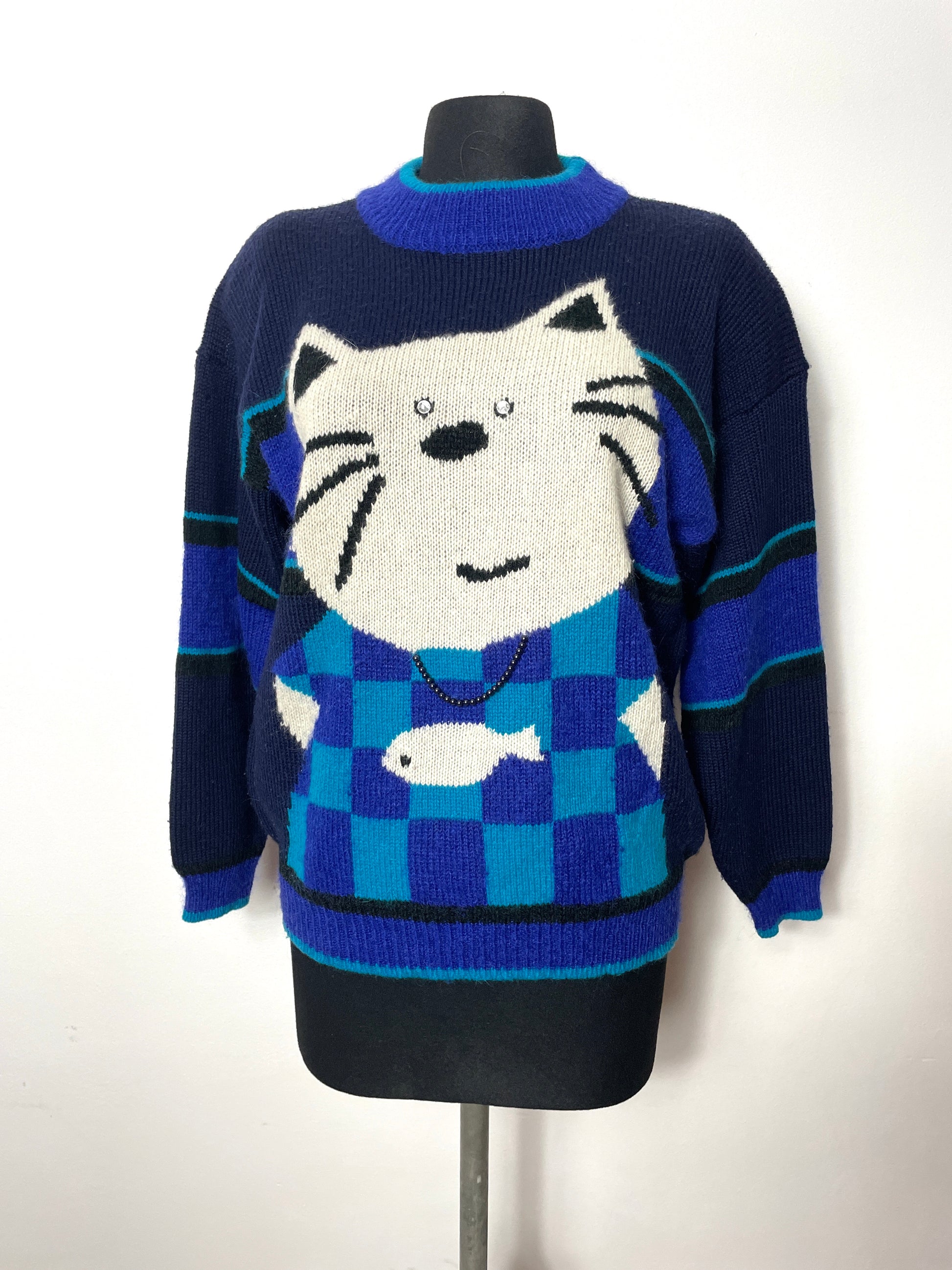 Pull vintage 80/90s René Derhy motif chat avec perles, taille 34 à 38, épaulettes, très bon état. Matière acrylique, laine, et angora.